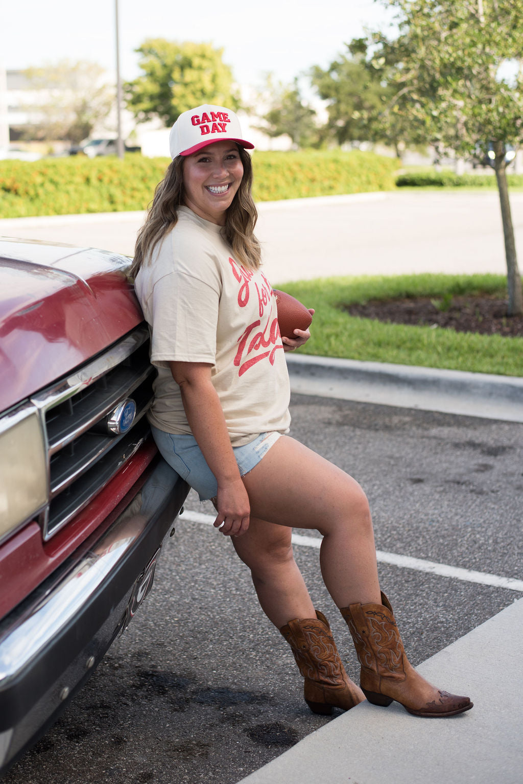 Celebrate football season in style with the GAME DAY Hat! Crafted for fun and flair, this hat is the perfect companion for cheering on your favorite team. Lightweight and comfortable, it keeps you looking cool as you enjoy every play, touchdown, and victory dance. Perfect for game day fun!