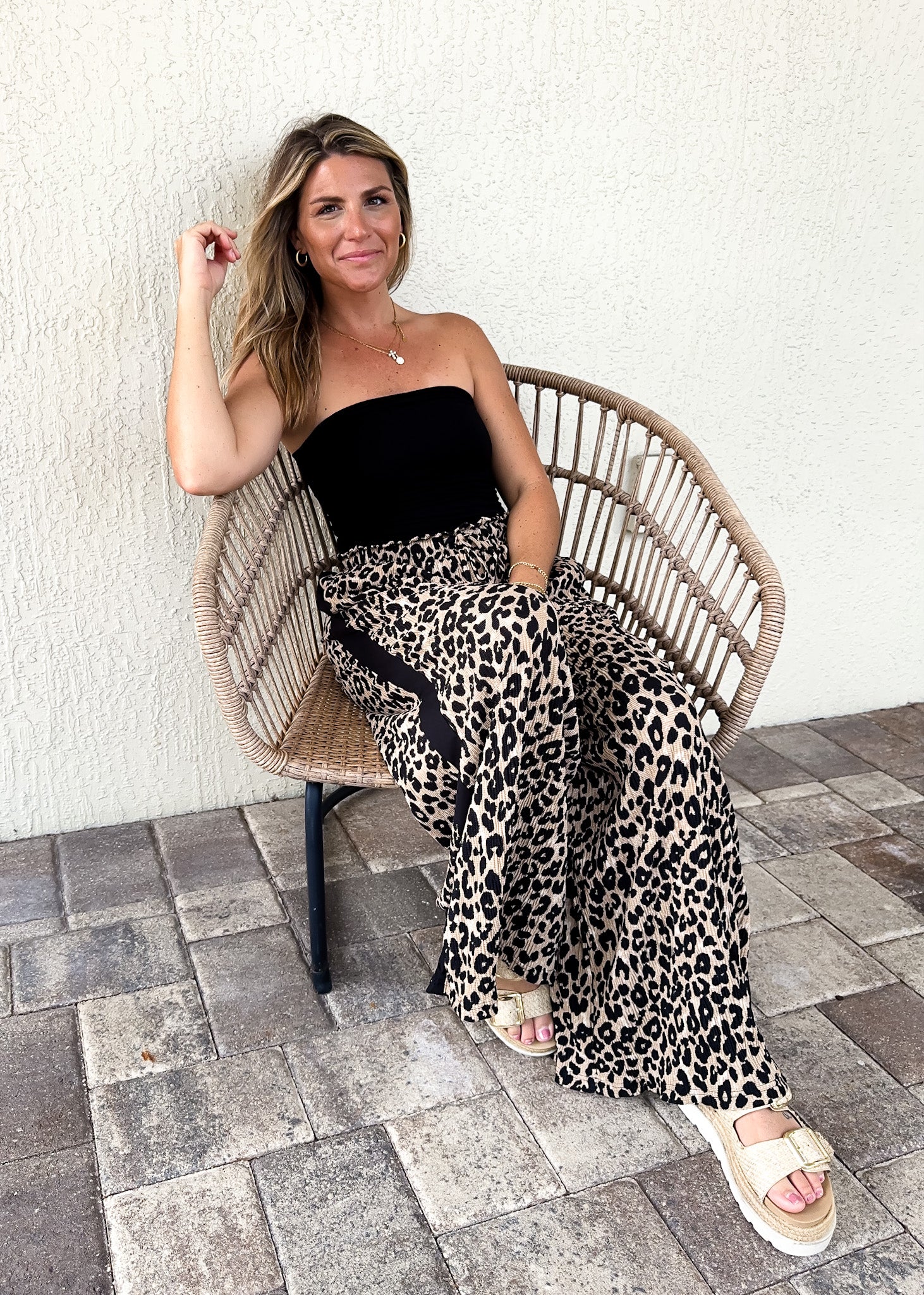 These Leopard Knit Pants combine elevated chic with exceptional comfort. Featuring elegant black stripe detail down the sides and an elastic waistband with a drawstring. Versatile for both casual and refined looks, these pants are a sophisticated addition to any wardrobe.